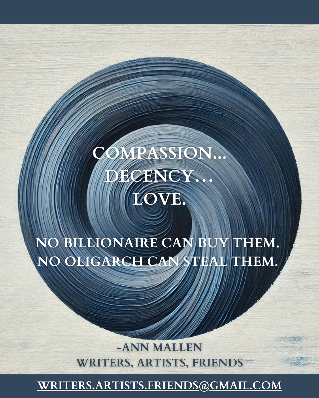 Early in 2025, Mallen emailed people she’d connected with over the years to share information about standing up for democracy and the rights of all. This morphed into a group called Writers, Artists, Friends. She planned virtual programs with professionals (psychologists, political scientists, and poets), who read their work and gave their thoughts about the moment.